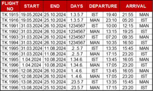 Asa cum deja si-a obisnuit publicul calator, compania nationala turca Turkish Airlines isi extinde frecventele de zbor spre diverse destinatii internationale. Acum anunta ca din luna mai a acestui an, zborurile spre Manchester vor fi operate cu o frecventa de 25 / saptamana. Programul de zbor, cu orele de decolare de la Istanbul si aterizare la Manchester , poate fi consultat in tabelul atasat. De altfel, sunt semnale ca programul de vara al TK se anunta extrem de interesant si ofertant.